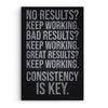 Minimalist bold typography featuring the quote “Results Happen Over Time Not Overnight Be Patient” serves as a daily reminder of Focus & Discipline, designed to inspire and fuel motivation in your living room. The black and silver tones match beautifully with modern décor décor, bringing balance and focus to your space.